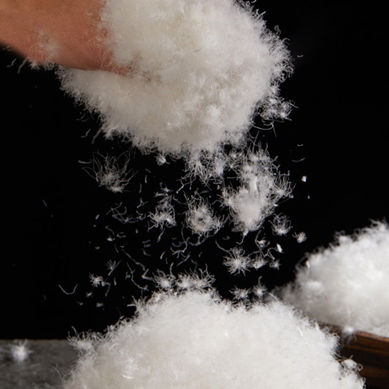 Prírodné páperie pochádza z oblastí brucha, krku a krídel vysokokvalitných bielych husí produkujúcich páperie a predstavuje jedinečnú formu jemných zhlukov, ako sú trstinové jahňatá, ktoré tvoria zlatý rez s vločkovitým perím. Keďže ide o vzácne živočíšne bielkovinové vlákno, povrch každého vlákna z husacieho peria je husto pokrytý miliónmi trojuholníkových pórov v nanoúrovni. Tieto presné póry sú ako zariadenia na mikroreguláciu teploty, ktoré dokážu inteligentne upraviť medzeru medzi vláknami podľa okolitej teploty a vytvoriť tak dynamickú sieť regulácie teploty. Keď sa teplý dych prirodzene vyžarovaný ľudským telom dostane do kontaktu s spodnou vrstvou, štruktúra pórov účinne uzamkne teplotu prostredníctvom adsorpcie na molekulárnej úrovni a zároveň vytvorí trojrozmernú tepelnoizolačnú bariéru, ktorá účinne blokuje cestu invázie vonkajšieho studeného vzduchu, čím prináša zážitok zo starostlivosti o konštantnú teplotu za každého počasia.